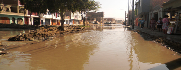 Varias calles de la avenida Aviación, una vez más, amanecieron inundadas provocando caos vehicular y molestias en los vecinos.Chimbotenlinea.com (Por: Lindberg Cruzado. Chimbote) Treinta viviendas del pueblo joven 12 de Octubre, en la zona conocida como “El Zanjón”, y en la prolongación Alfonso Ugarte, se encuentran inundadas desde esta madrugada por aguas servidas debido al colapso del sistema de alcantarillado provocado por el desborde del dren que cruza este sector.