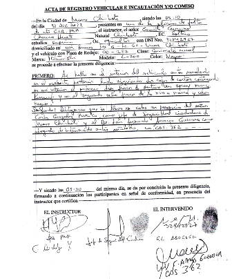 Con fecha 31 de diciembre 2012 y con rúbrica del suboficial de tercera C. Hidalgo Y., el documento policial señala que a las 04.40 horas de ese día se prestó apoyo a efectivos de Seguridad Ciudadana de Nuevo Chimbote para la intervención de la camioneta de color negro con placa de rodaje OD-1287 la cual “habría estado realizando pintas en las paredes contra el alcalde de Nuevo Chimbote”.