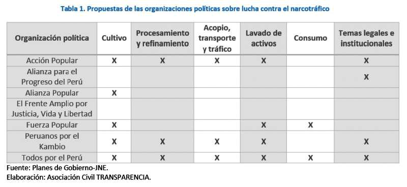 Transparencia, usando su herramienta digital Compara Ya, nos presenta un resumen comparativo de los los planteamientos de las organizaciones políticas que participan en las Elecciones Generales 2016, referidos a a lucha contra el narcotráfico; siguiendo la cadena del narcotráfico, añadiéndole al final una columna relacionada con propuestas de naturaleza institucional y normativa.