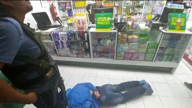 “Los Botiqueros de Chimbote” estaban a punto de robar el dinero de la venta del día y medicinas, pero la intervención policial los sorprendió. Los agentes los arrojaron al suelo y después los llevaron al Departamento de Investigación Criminal de Chimbote.