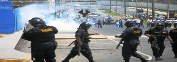 Chimbotenlinea.com (Por: Lindberg Cruzado).-Dos maestros heridos y más de una docena con serios problemas de asfixia dejaron como saldo violentos enfrentamientos registrados al mediodía entre los huelguistas y la policía que arrojó gas lacrimógeno por todos lados y atacó a palos a los manifestantes en pleno centro de Chimbote.