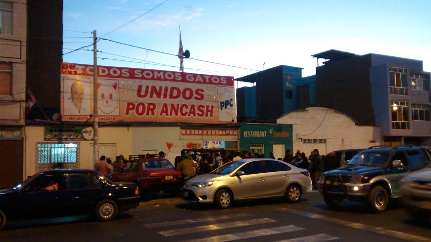 A las 7.30 p.m. los militantes de Puro Áncash se concentraron en su local principal de la plaza de armas de Chimbote para seguir celebrando y esperar también los resultados oficiales de la ONPE, que se emitirán a partir de las 9 p.m.