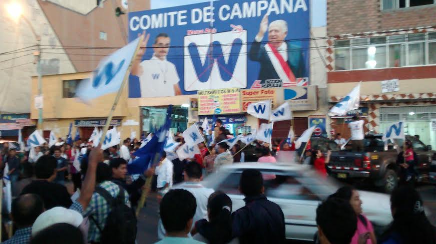 Chimbote en Línea. (Elecciones 2014)-A las 6 de la tarde, cuando empezaron a replegarse los personeros del movimiento Puro Áncash de los locales de votación a su centro de cómputo, ubicado en la tercera cuadra de la avenida José Pardo, empezaron las celebraciones por un posible triunfo del candidato Waldo Ríos Salcedo en la Segunda Elección Regional.