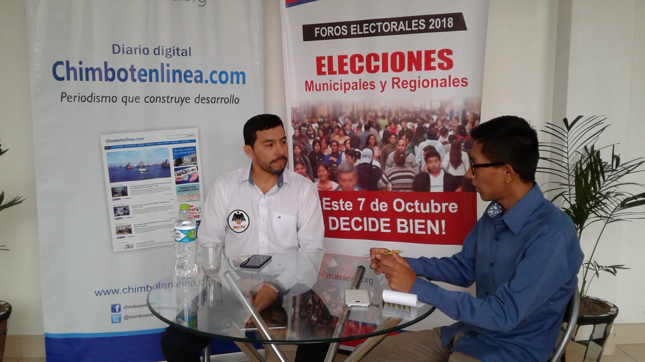 Chimbote en Línea.- Continuando con el desarrollo del Foro Electoral que organiza el diario digital Chimbote en Línea, bajo la veeduría de la Asociación Civil Transparencia, de cara a los comicios del 07 de octubre próximo, tuvimos la oportunidad de entrevistar al candidato a la alcaldía distrital de Nuevo Chimbote, Jorge Genni Sosa, quien está en carrera electoral por el Movimiento Acción Nacionalista Peruano (Manpe).