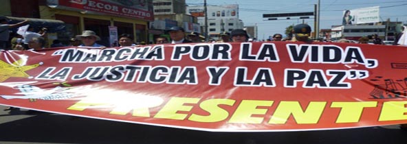Unas dos mil personas, de todas las edades, de diferentes parroquias de Chimbote, sociedad civil, colegios profesionales, estudiantes universitarios y algunas autoridades locales, se unieron en una sola voz en la “Marcha por la Vida, la Paz y la Justicia”, convocada por la Diócesis de Chimbote y el Colegio de Abogados del Santa, para decir BASTA YA a la violencia que impera en nuestra ciudad y No a la cultura de Muerte y la Impunidad. (Por: Mónica Gismondi)