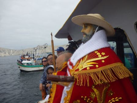 Nuestro patrono fue colocado en la embarcación llamada Hillary II, en donde sus tripulantes recibieron a la venerada imagen con mucho amor y donde la alegría contagió e hizo baliar a los presentes. Luego se hizo el trasbordo del Santo patrón a la embracación principal Rivar IV, donde esperaban las principlaes autoridades locales y regionales, capitanes y comandantes portuarios; asimismo de la