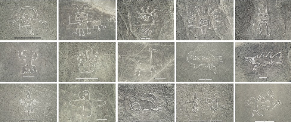 Los descubrimientos hechos, representan motivos antropomorfos (humanos) y en menor cantidad, motivos de animales de la zona y otras figuras que se encuentran cerca de senderos y caminos que atraviesan la Pampa de Nasca, que han sido hechas en alto y bajo relieve, las cuales usualmente se encuentran en grupos y son de tamaños pequeños en comparación con las famosas Líneas de Nasca.