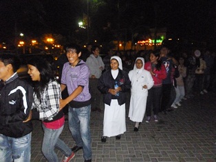 El frontis de la Catedral por unas horas fue pista de baile para los jóvenes, religiosas, sacerdotes y madres de familia que acompañaron a este gran acto diocesano.   Se hicieron presentes los grupos musicales cristianos, Generaciones, Jupusa y Los Carismáticos.