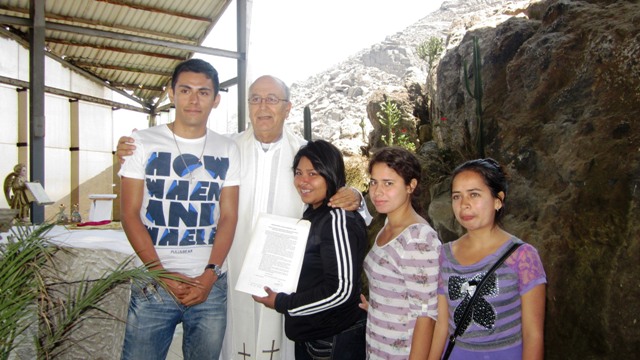 Allí los esperaba el Obispo de Chimbote para proceder a desarrollar una misa, con la asistencia de las autoridades sampedranas, docentes y estudiantes. Concluida la celebraciòn litúrgica un grupo de alumnos se acercó a leer un documento al que llamaron Pronunciamiento Juventud Sampedrana y la Paz, que motivados por la masiva asistencia, habían redactado los delegados durante el trayecto a la cima del Cerro de la Juventud, por que en su construcción colaboraron miles de estudiantes de Chimbote.