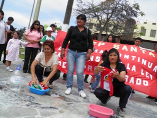 (Chimbotenlinea.com).- Los maestros afiliados al SUTE Santa realizaron esta mañana un acto simbólico de lavado de banderas en la plaza de armas de Chimbote para protestar y rechazar el proyecto de ley de la reforma educativa presentado en el Congreso de la República por el gobierno del presidente de la República Ollanta Humala Tasso.