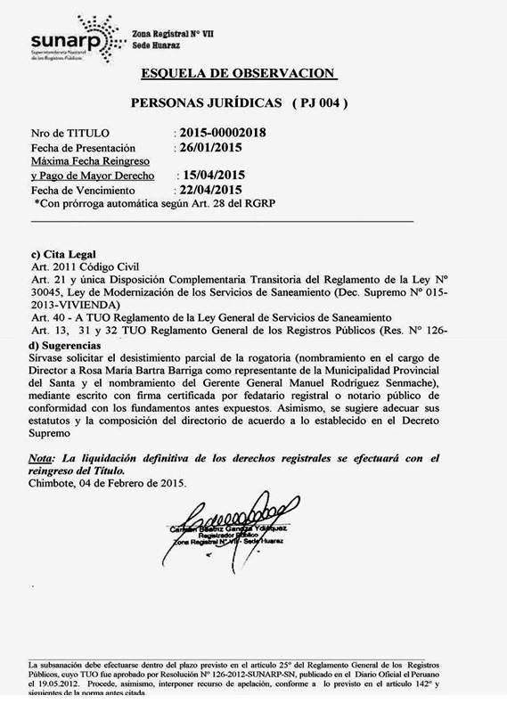 Chimbote en Línea.- Tal como se había advertido la designación del gerente general de Sedachimbote Manuel Rodríguez Semanche y la representante de la comuna en el directorio, Rosa María Bartra Barriga fueron observadas por Registros Públicos, debido a irregularidades en sus respectivos nombramientos.