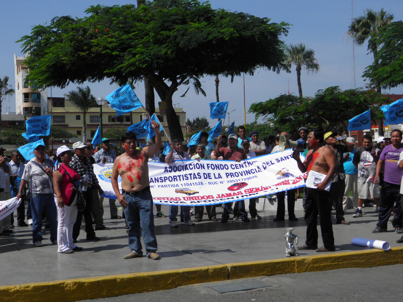 Luego de varios minutos los quejosos abandonaron ese punto para trasladarse hacia la Plaza de Armas. En su recorrido varios de ellos se sacaron los polos para luego realizar un plantón frente a la Municipalidad Provincial del Santa, donde exigieron a la alcaldesa, Victoria Espinoza desistir de la pretensión del incremento de la tarjeta cuyo costo va de S/. 38.50 a S/. 96.25. El derecho de trámite para los choferes nuevos es de 7 soles adicional.
