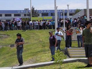 Chimbote en Línea (Locales).-Los estudiantes de la Universidad San Pedro (USP) tomaron esta mañana por espacio de tres horas el campus, ubicado en la urbanización Los Pinos, para con pancartas y banderolas en mano reclamar la renuncia del rector José María Huamán Ruiz, a quien acusan de haber realizado una gestión plagada de hechos de corrupción y abusos de autoridad contra docentes.