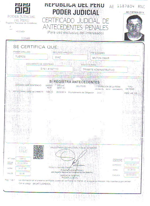 Se trataría del candidato a la secretaria general que se presentó por la lista No 1, Milton Omar Tueros Díaz, quien estaría sentenciado por omisión a la asistencia familiar dictado por el Segundo Juzgado Unipersonal de Chimbote.