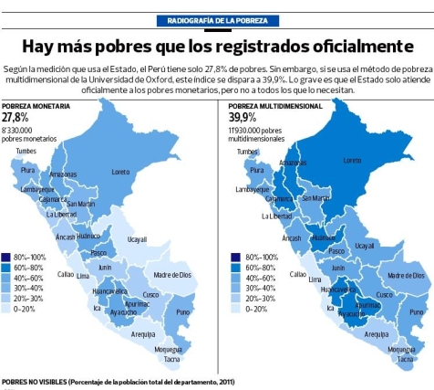 Vásquez, por su parte, señala que si lo que se mide también es el limitado acceso a servicios de salud, electricidad, agua y educación o a quienes usan carbón o leña para cocinar la figura cambia. Si se toman en cuenta estos factores, el nivel de pobreza en el país habría que situarlo en el 39,9% de la población, es decir en 11,9 millones de peruanos.