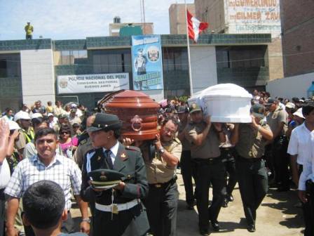 Chimbotenlinea.com (Por: Cintia Cabrera).- Una mañana distinta y muy nostálgica se apreció hoy en la comisaría de Buenos Aires, donde los efectivos policiales vistiendo el uniforme de honor dieron el último adiós a su compañero y amigo, el suboficial PNP José Daniel Vásquez Villalta y a su esposa Gisella Margot Alarcón Maestre, ambos fallecidos en un terrible accidente de tránsito, el domingo último cerca a Tortugas(Casma).