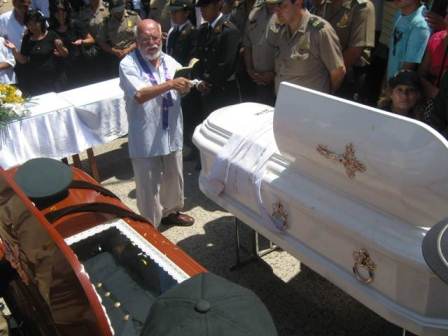 En el frontis de la comisaría de Buenos Aires se ofreció una breve misa de cuerpo presente a ambos féretros, que eran acompañados por una multitud.