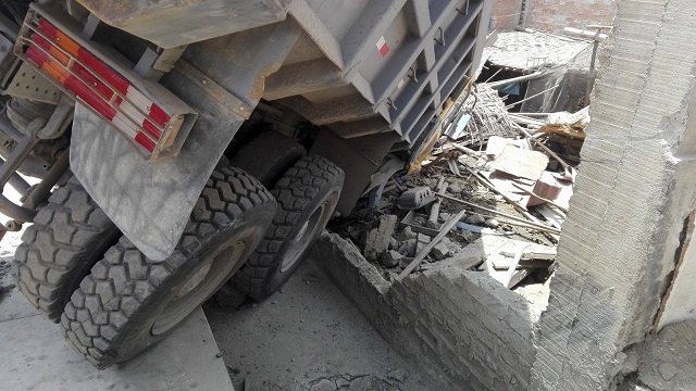 “Estuve limpiando el corral cuando de pronto escuché un fuerte estruendo y entonces corrí hacia la parte de mi cocina y vi como un volquete derribó mi pared de ladrillo y ha matado a mis animales. Yo crío cuyes, patos, pavos, no sé cuantos han muerto aplastados porque ese pesado vehículo sigue dentro de mi casa”, informó.