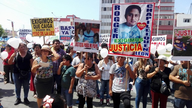 Hoy se cumple 10 meses del cruel asesinato cometido contra Roger Chapilliquén y los familiares no encuentran justicia, por eso salieron a las calles con carteles y lanzando arengas para pedir que el homicidio de un padre de familia que dejó en la orfandad a una esposa y dos hijos de 6 y 2 años no quede impune. Los manifestantes llegaron hasta las sedes del Poder Judicial y el Ministerio Público en Chimbote para hacer sentir su voz de protesta.