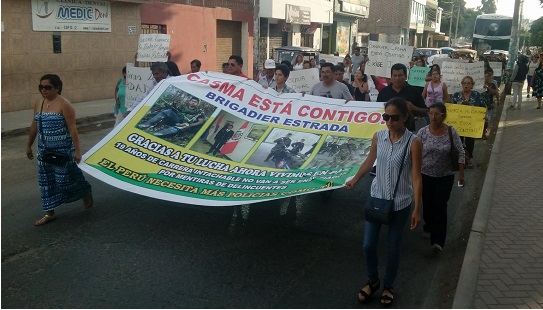 Chimbote en Línea. – Mientras el jefe del Grupo Terna de Casma, Oscar Ronal Estrada Salinas, se encuentra prófugo de la justicia, sus familiares y amigos encabezaron una marcha pacífica por las principales calles de Casma rechazando los 36 meses de prisión preventiva que se ordenó en su contra.