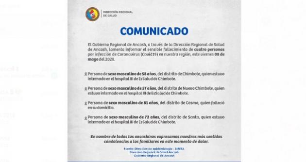Chimbote en Línea. – La Dirección Regional de Salud confirmó la muerte de cuatro varones en la zona costa de Áncash, aumentando a 106 el número de fallecidos por coronavirus a 106 en esta región.