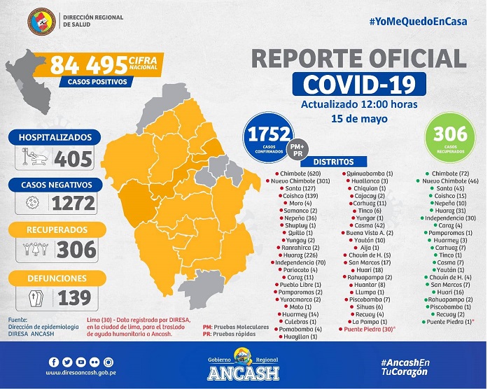 Chimbote en Línea. - El coronavirus hasta hoy ha causado lamentablemente la muerte de 139 pacientes en Áncash y se han recuperado 306 en una región donde se han confirmado 1,752 casos de la pandemia.