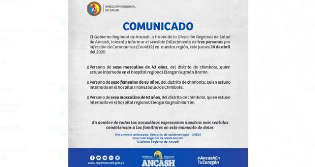 Dos varones y una mujer fallecieron con Covid-19 en Áncash y víctimas mortales aumentaron a 57