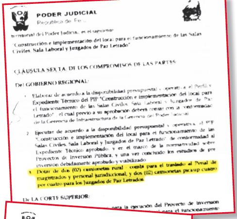 ¿Para qué sirvieron esos convenios? Dieron“luz verde” para que el Gobierno Regional desembolse un monto indeterminado de dinero (no se fijó la cantidad, pero fue más de S/.15 millones) para la construcción y el equipamiento de la Corte Superior de Justicia del Santa así como para la compra de cuatro camionetas para el traslado de los jueces.