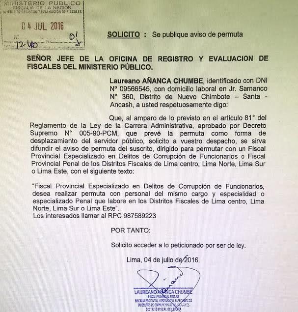 Así se desprende de una solicitud enviada a la Jefatura de la Oficina de Evaluación y Registro de los Fiscales Superiores del Ministerio Público, firmada por Añanca Chumbe y enviada a este despacho el 4 de julio último; documento que se encuentra hoy en todas las salas de redacción de los medios locales chimbotanos.
