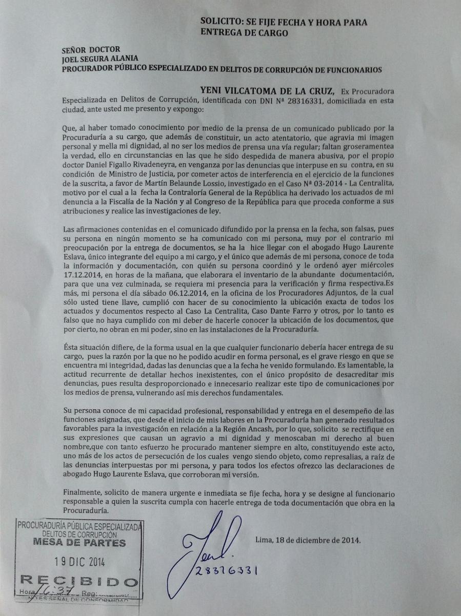 En su misiva Vilcatoma también advierte que este comunicado de la Procuraduría es uno más de los actos de persecusión como represaria por la denuncia hecha contra el ministro de Justicica Daniel Figallo.