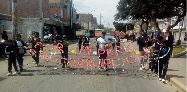Mientras que escolares de la institución educativa Fe y Alegría N° 14, ubicada en el distrito de Nuevo Chimbote se apostaron en varias avenidas portando una gigantografía en rechazo a la corrupción que ha generado una crisis en el sistema de justicia. (Redacción Central)