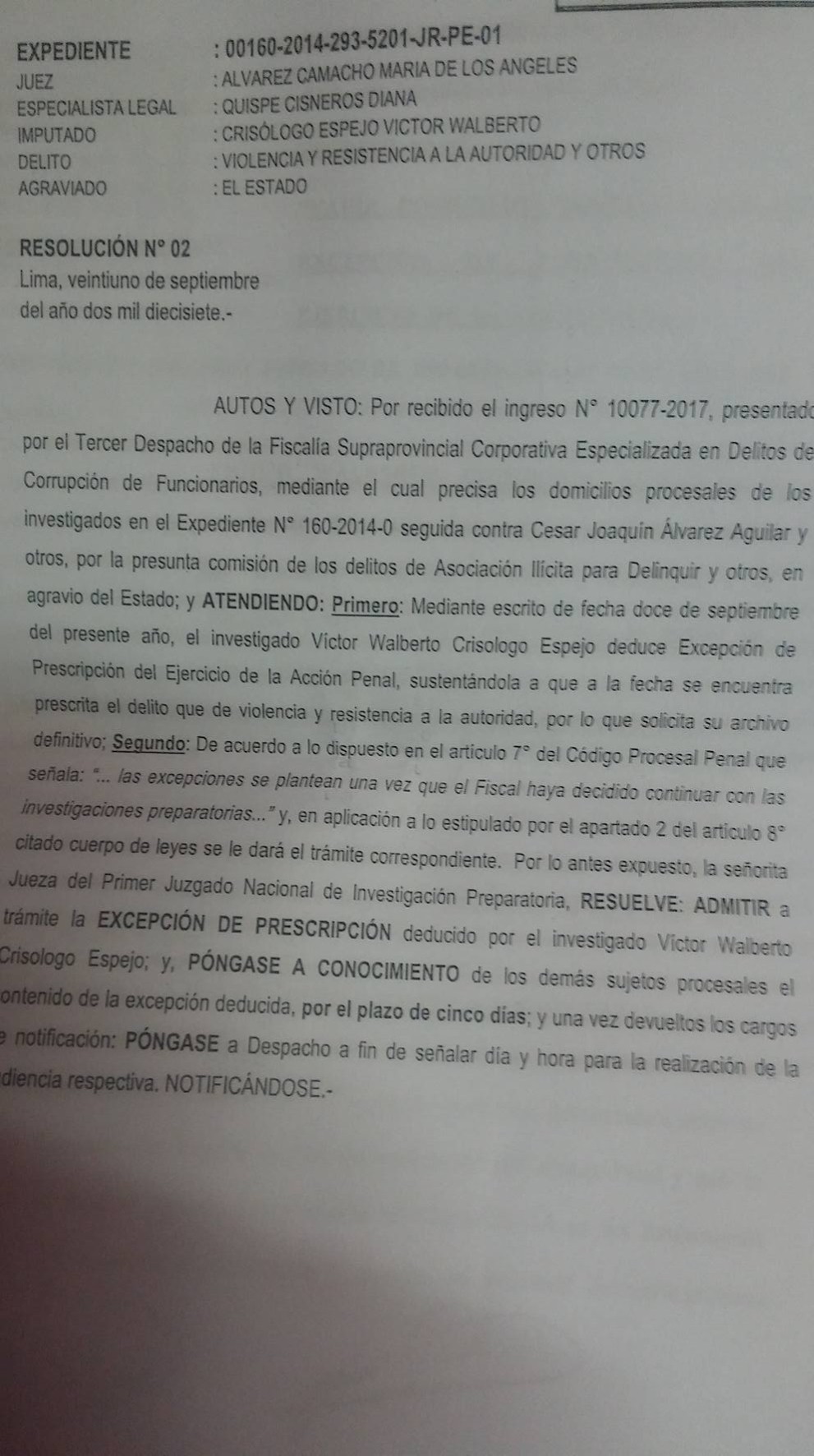 Vale precisar que Víctor Crisólogo Espejo es investigado en la carpeta fiscal 160- 2014 por el caso La Centralita, donde encabeza el preso César Álvarez Aguilar acusado de la presunta comisión del delito de asociación ilícita para delinquir y otros.
