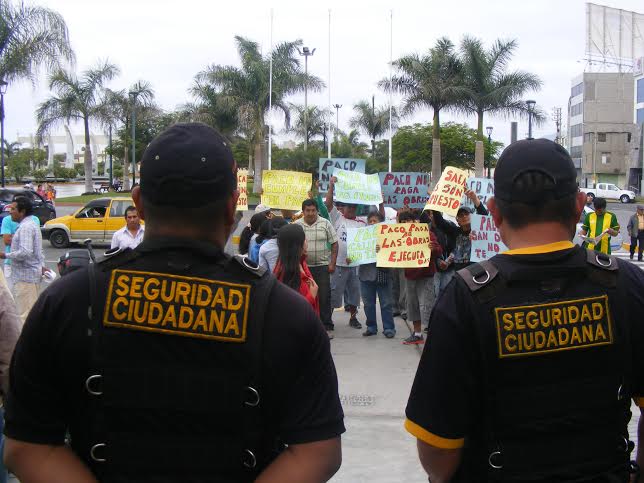 Con arengas protestaron exigiendo al alcalde Francisco Gasco Barreto, cancele a la empresa constructora “California” pues se le está adeudando cuatro valoraciones de más de 2 millones de soles.