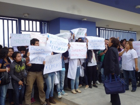 Son más de 450 estudiantes los afectados que hoy expresaron su reclamo con pancartas y hasta impidieron el ingreso de la Decana de la Facultad de Medicina, Elizabeth Llerena, quien al llegar a sus labores fue confrontada por el alumno Jorvi Suárez, al expresar el pliego de reclamos. Uno de los puntos, la irregular elección del próximo decano sin voz y voto de la representación estudiantil.