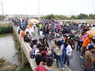 Los estudiantes provistos de banderolas tomaron el puente Lacramarca, algunos se colocaron en ambos extremos mientras que otros prefirieron sentarse sobre la vía. Ellos protestan contra el artículo 7 de la Ley 29914 que considera que el ascenso de los docentes contratados sea cancelado con los recursos directamente recaudados de la institución y por ende una de las alternativas serían el incremento de matrícula.